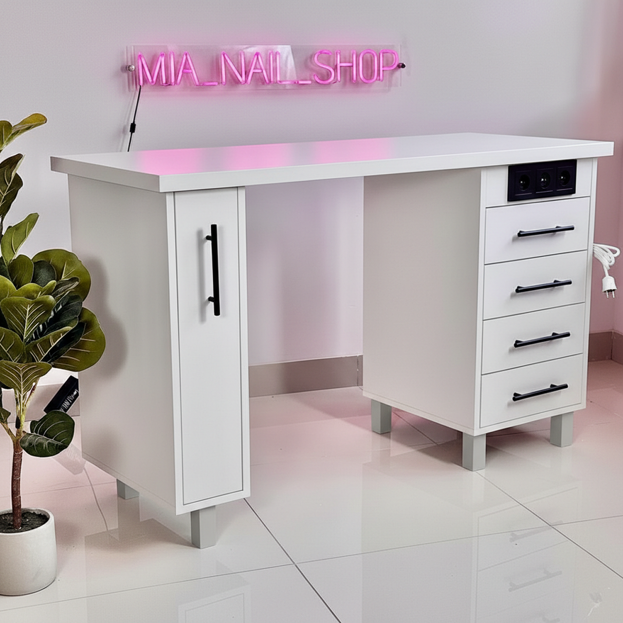 · Конструкция: Четыре выдвижных ящика, расположенных вертикально с одной стороны, выдвижная бутылочница для гель-лаков, 3 встроенных розетки.