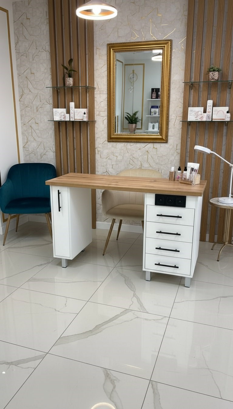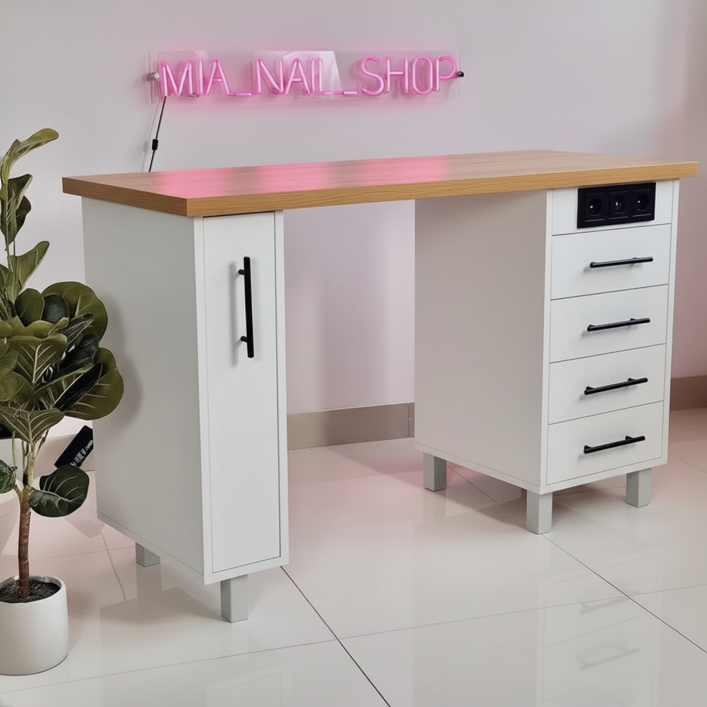 · Особенности: Вместительные ящики, удобная бутылочница под гель-лаки, эргономичная высота, классический дизайн, 3 встроенных розетки.