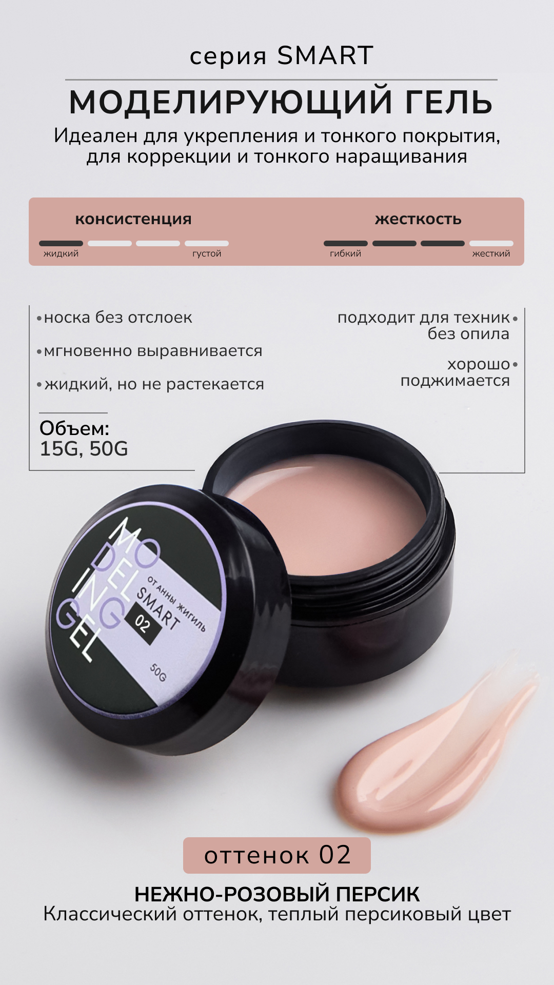 Smart-гели отлично подходят для укрепления и коррекции коротких и средних ногтей. Они могут использоваться для наращивания и моделирования как на типсах, так и на нижних и верхних формах. Моделирующий гель отлично держит форму, не даёт усадки и не пузырится.