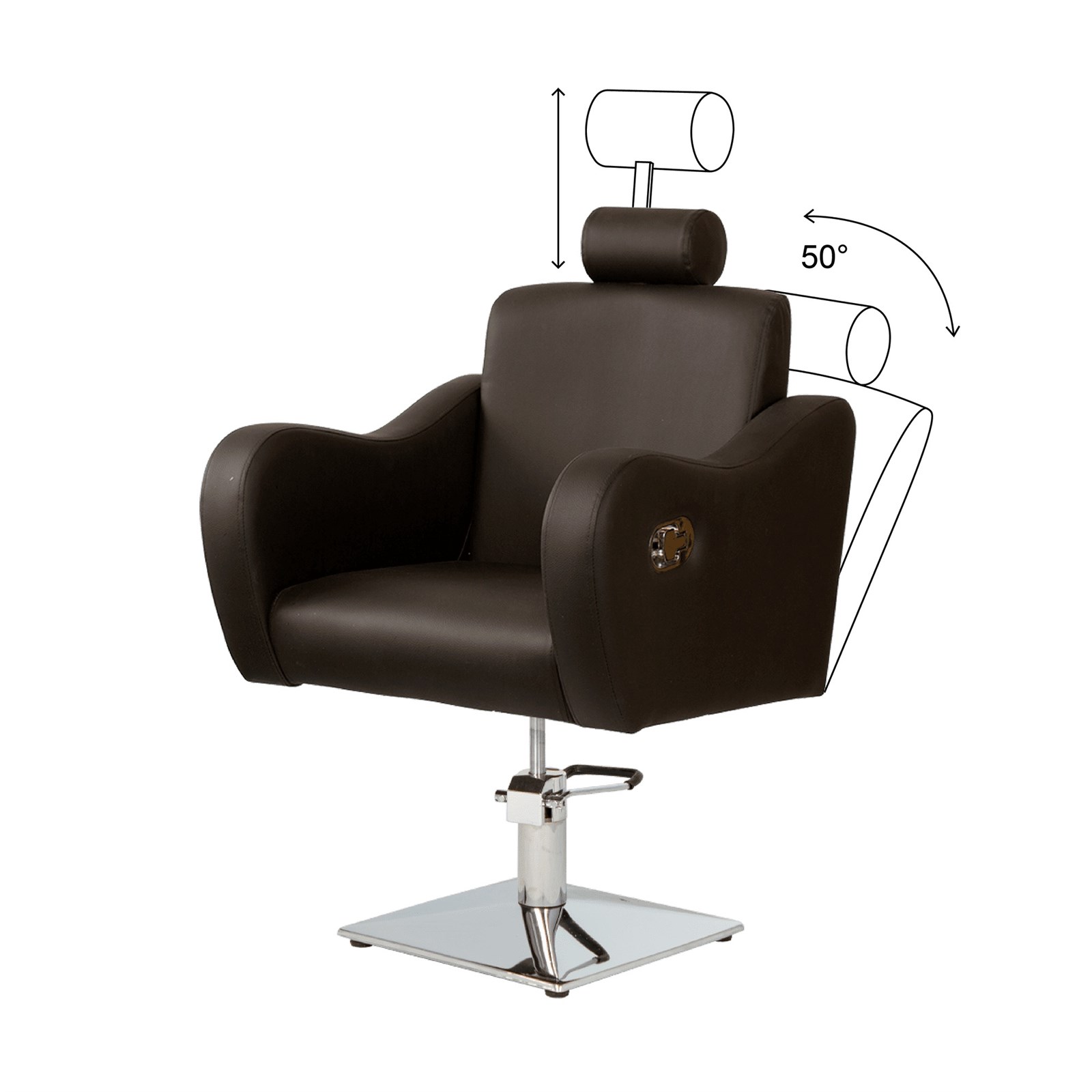 Стильное и комфортное кресло дополнено подголовником, который можно снять при необходимости. Спинку парикмахерского кресла можно регулировать с помощью пневматического механизма, фиксируя наклон. Высота регулируется гидравлическим подъемником.