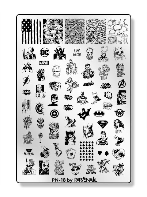Настоящая находка для любителей супергероев и поп-арта! Железный человек, Бэтмен, Супермен, Человек-паук, Дэдпул, Харли Квинн и другие яркие персонажи Marvel и DC. С этой пластиной клиент получит супер стильный и оригинальный дизайн. На пластине вы найдёте как миниатюрные элементы, так и готовые композиции, что позволит украсить ногти любого размера и формы. Высокое качество прорези и гравировки рисунков.