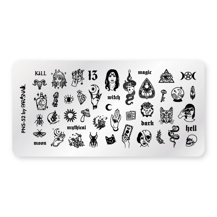 Пластина с узорами и надписями в магической тематике. Она позволяет быстро создать оригинальный маникюр, обладает высоким качеством гравировки и обеспечивает точное отпечатывание мельчайших деталей.