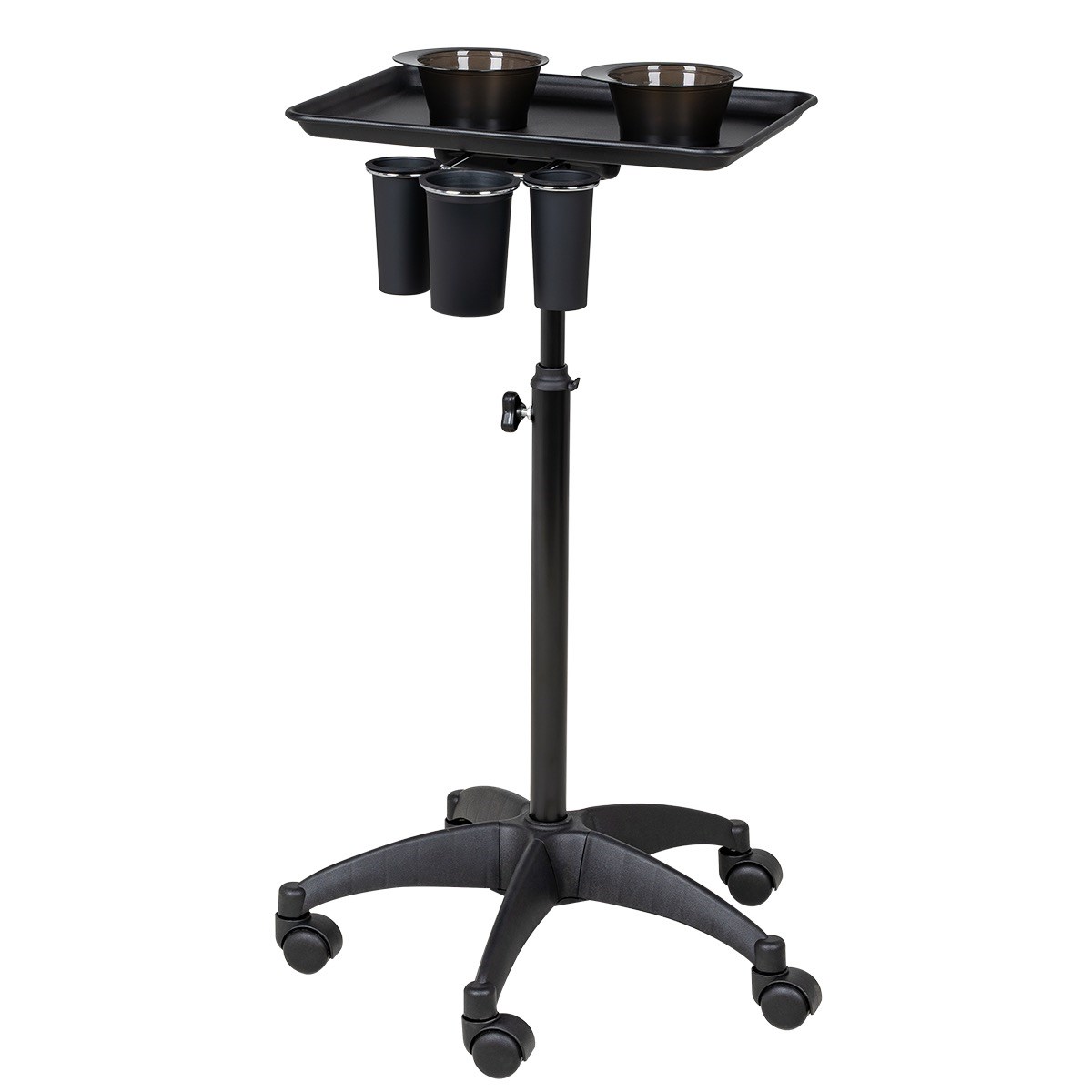 Каркас тележки изготовлен из прочного металла, благодаря пластиковому пятилучью на колесиках ее легко перемещать. Специальное хромированное покрытие надёжно защитит от коррозии. Верхняя часть тележки – металлическая крышка на чёрной матовой трубе с магнитными чашами и удобным держателем для ёмкостей, что весьма удобно не только для работы, но и после неё, чаши легко моются. Материал оборудования устойчив к моющим и дезинфицирующим средствам, а также не деформируется от воздействия агрессивных продуктов.
