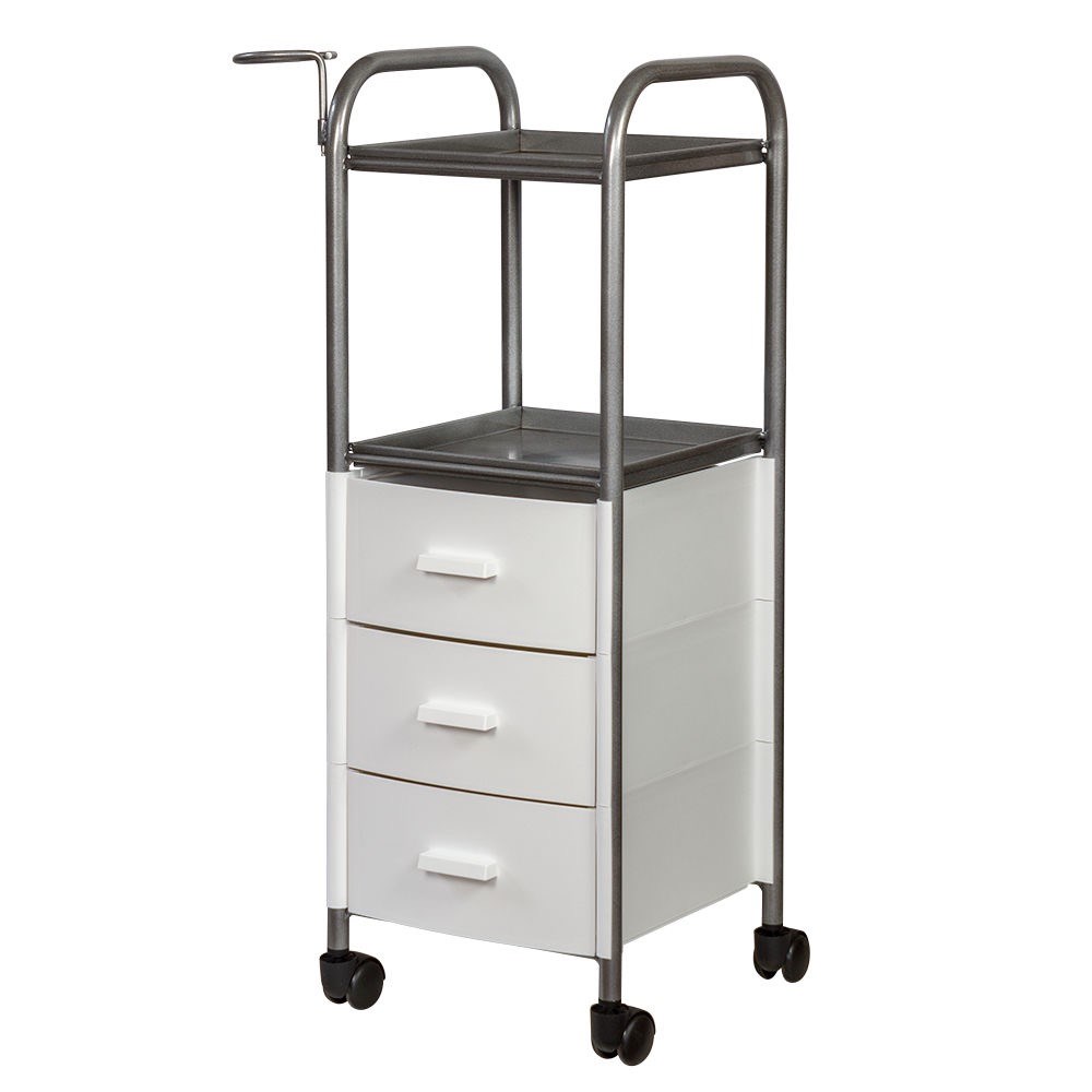 На двух полках достаточно места, что расставить инструменты, аксессуары и расходные материалы первой необходимости. В трех ящиках много места для хранения остальных приспособлений. Удачное дополнение парикмахерской тележки – удобный держатель для фена на боковине. Благодаря встроенным колесикам можно передвинуть тележку в нужное место.