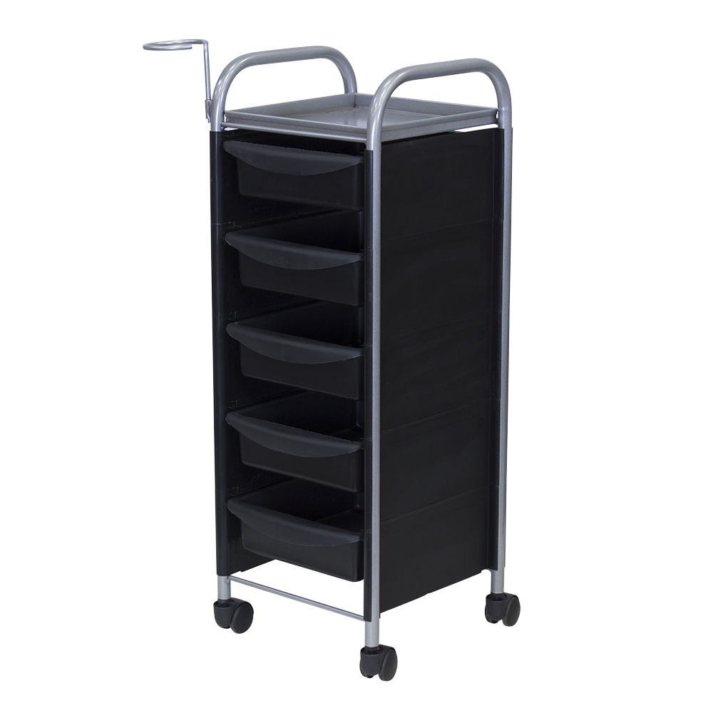 Купить тележку парикмахерскую М-02 можно с пятью вместительными выдвижными ящиками из ударопрочного пластика. Также для инструментов и прочих рабочих принадлежностей предусмотрена функциональная полочка. Для дополнительного удобства во время работы к каркасу прикреплен съемный фенодержатель.