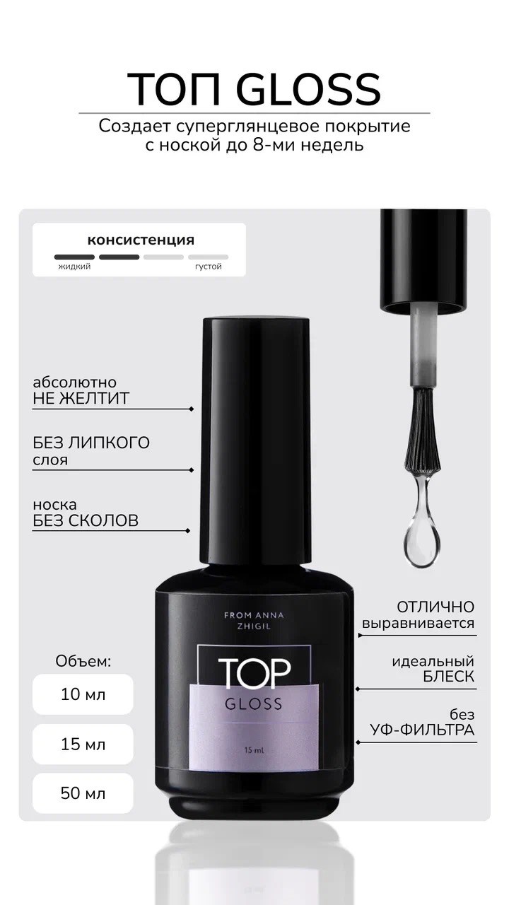 Укрепляющий гель с удобной кисточкой подойдет для профессионалов и новичков. Супер финиш с эффектом глянца можно использовать дома и в салоне. Топ с зеркальным блеском сохраняется до 8 недель. Closs Анны Жигиль - это завершающий шаг в создании идеального маникюра!